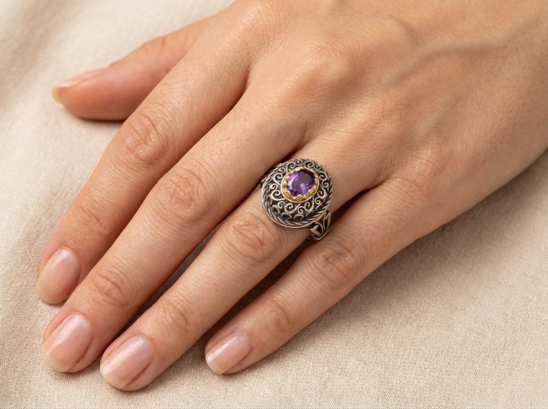 ΒΥΖΑΝΤΙΝΟ ΔΙΧΡΩΜΟ ΔΑΧΤΥΛΙΔΙ ΑΣΗΜΙ925 ΕΠΙΧΡΥΣΩΣΗ Κ18 ΚΑΙ ΑΜΕΘΥΣΤΟ ΠΕΤΡΑ