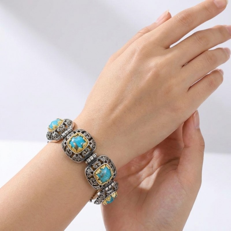 ΧΕΙΡΟΠΟΙΗΤΟ ΒΥΖΑΝΤΙΝΟ ΒΡΑΧΙΟΛΙ ΑΣΗΜΙ925 ΕΠΙΧΡΥΣΩΣΗ Κ18 ΜΕ COPPER ΤΥΡΚΟΥΑΖ ΠΕΤΡΕΣ